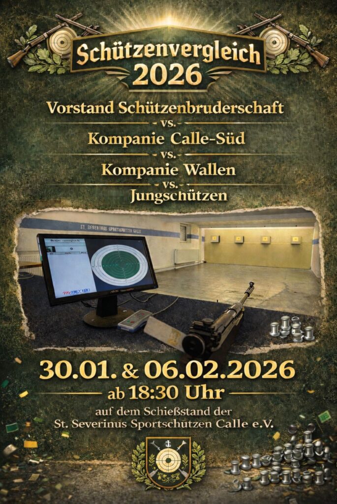 Die Abteilung der Sportschützen der St. Severinus-Schützenbruderschaft Calle 1658 e.V. lädt zum traditionellen Schützenvergleich am 30.01. und 06.02.2026 in den Schießkeller der Schützenhalle ein. Dabei treten in bewährter Form die Mannschaften des Schützenvorstandes, der Schützenkompanie Calle-Süd, der Schützenkompanie Wallen und der Jungschützen auf dem Schießstand an.