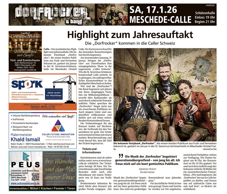 Die Dorfrocker & Band Party am 17.01.2026 in der Caller Schützenhalle ist als ein voller Erfolg zu werten. Rund 400 Besucherinnen und Besucher sorgten für eine überaus volle Schützenhalle und eine ausgelassene Partystimmung. Die Dorfrocker heizten dabei dem Publikum ordentlich ein. Beigefügt sind noch die Fotostrecken der örtlichen Presse verlinkt.